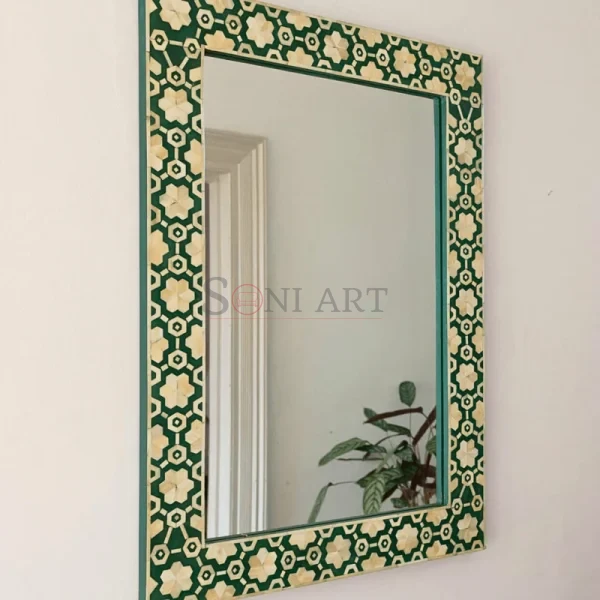 Emerald Geometric Bone Inlay Wall Mirror – Handcrafted Green & Ivory