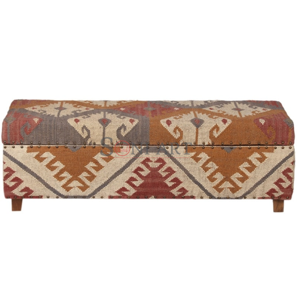 Ivory Artisan Print Kilim Upholstered Wooden Storage Ottoman Bench