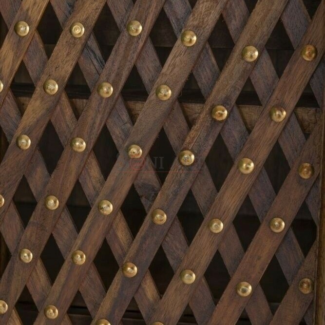 The front of the sideboard features intricately hand-carved wooden jali work on both doors, reflecting traditional Indian craftsmanship. Accentuated with classic brass fittings, the detailing adds a sophisticated vintage appeal, making this piece not just a storage unit, but a focal point in any room.
