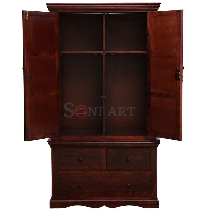 Welcome the Cardona Solid Sheesham Wood Wardrobe into your home, a piece that exudes sophistication and functionality. This wooden wardrobe for bedroom storage, with its mahogany finish and Sheesham wood construction, is a testament to fine craftsmanship and design.