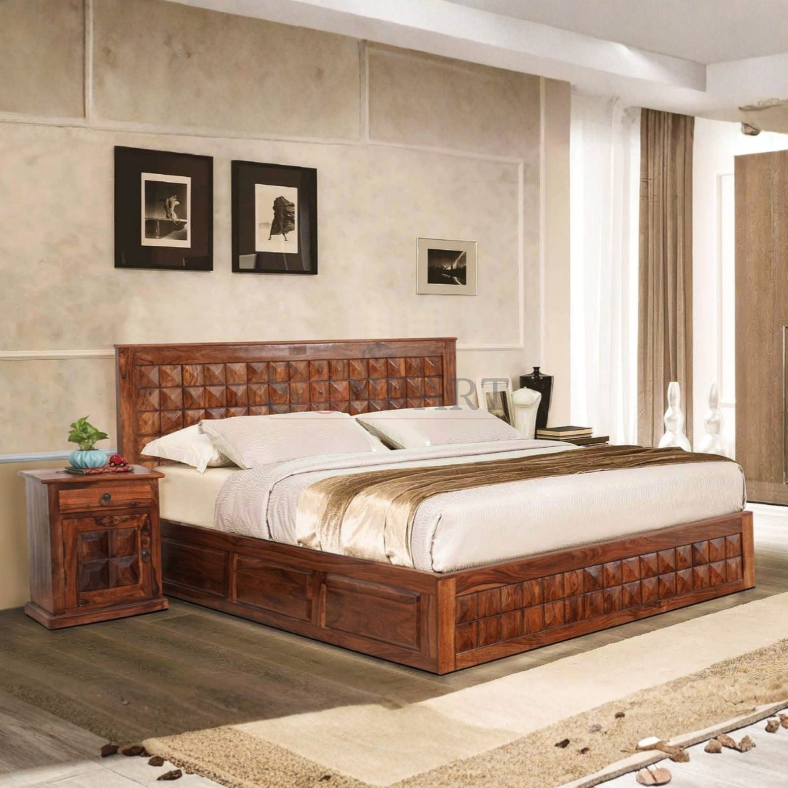 Designed for both beauty and practicality, this wooden double bed features built-in storage, making it an ideal choice for those who value both aesthetics and space optimization. The storage compartments provide ample room for bedding, seasonal clothes, and other essentials, keeping your bedroom organized and clutter-free. The sturdy Sheesham wood construction ensures long-lasting durability, offering both comfort and reliability for years to come.