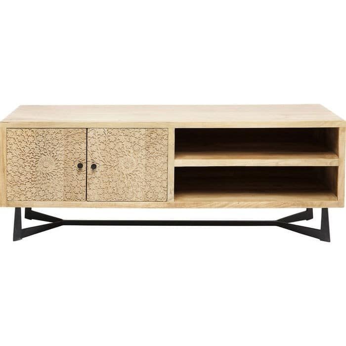 Designed for both style and functionality, this wooden TV unit with storage offers a perfect combination of closed and open compartments. The carved double-door cabinet provides concealed storage for remotes, DVDs, books, and accessories, helping you maintain a clean and organized entertainment area. The open shelves are ideal for placing set-top boxes, gaming consoles, speakers, or decorative accents, ensuring easy accessibility.