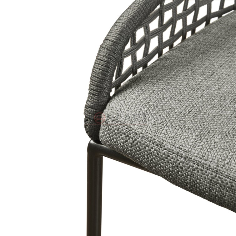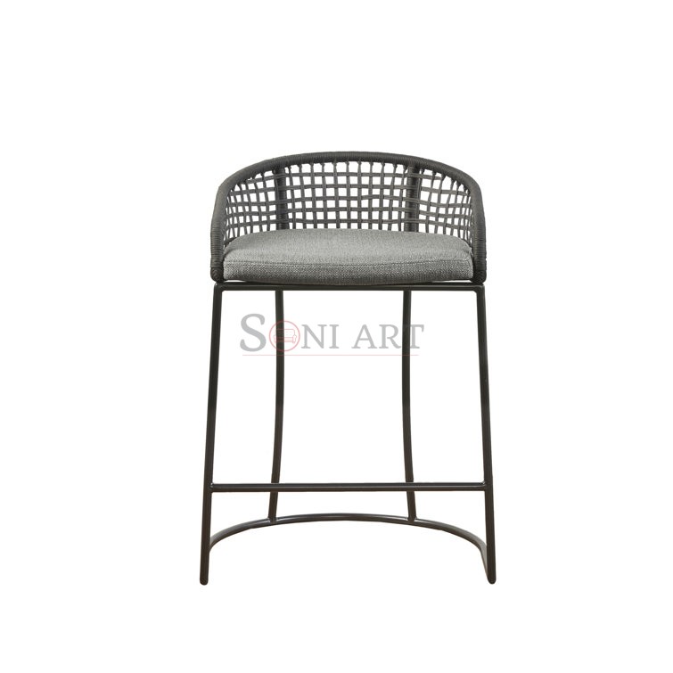 The metal bar stool features a plush upholstered seat in a dark gray heathered fabric, offering soft cushioning for everyday comfort. Complementing this is a beautifully hand-woven natural rope backrest that adds organic texture and visual interest while maintaining a light, open feel. The low-back design provides subtle support without overpowering your space, making it perfect for modern layouts.