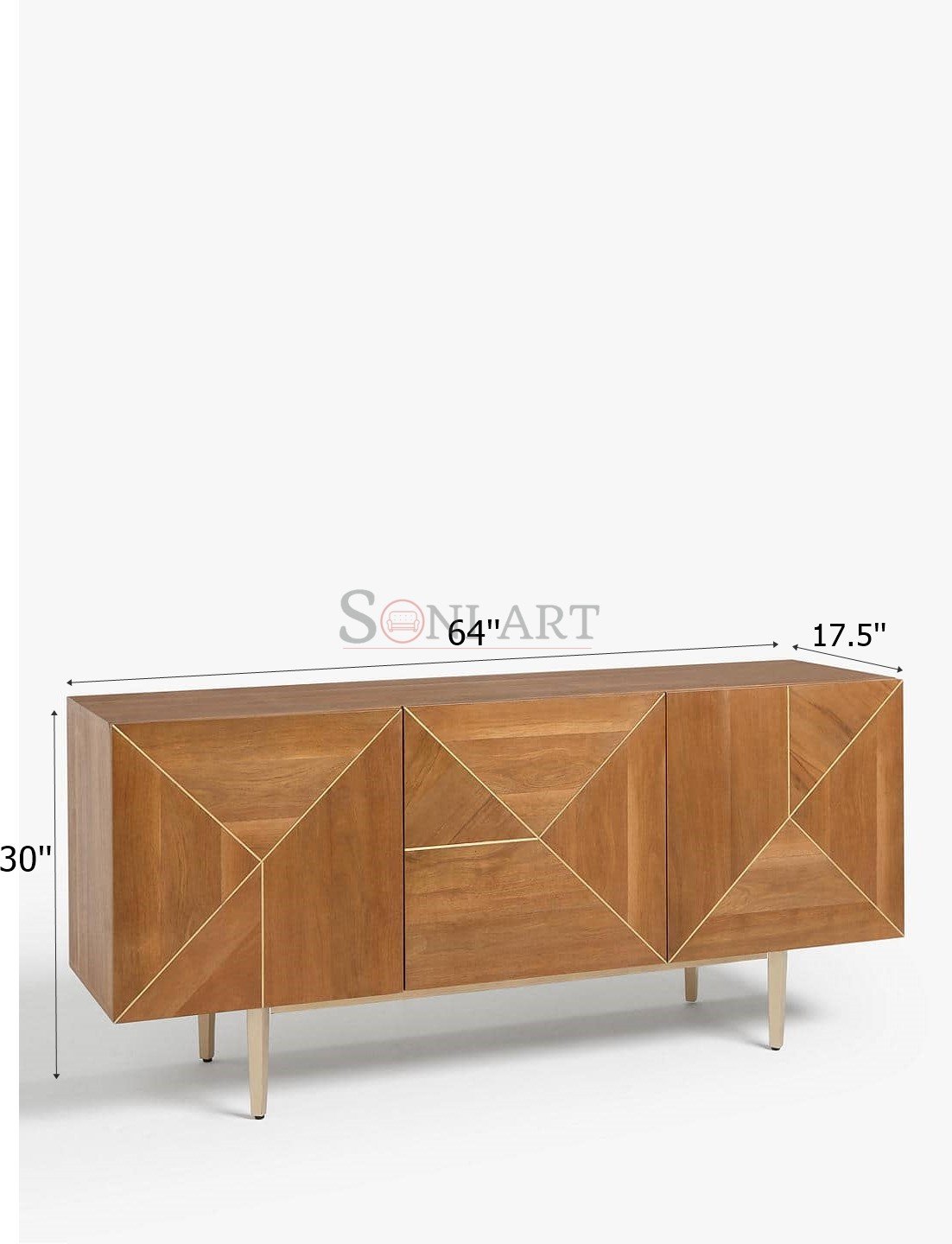 The foundation of the unit is forged from wrought iron and finished in a striking golden hue, providing a robust base and a captivating contrast to the wood. This buffet cabinet is not merely a storage solution; it’s a statement piece that enhances the aesthetic appeal of your kitchen.