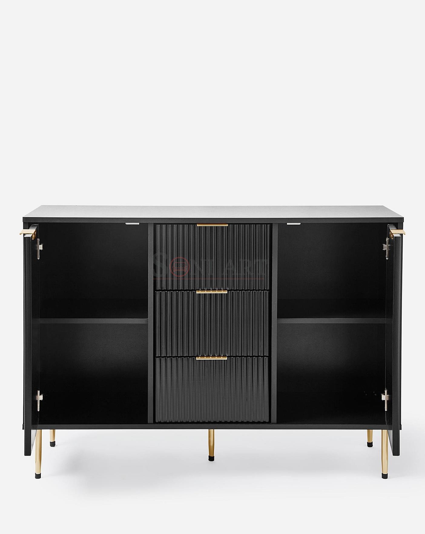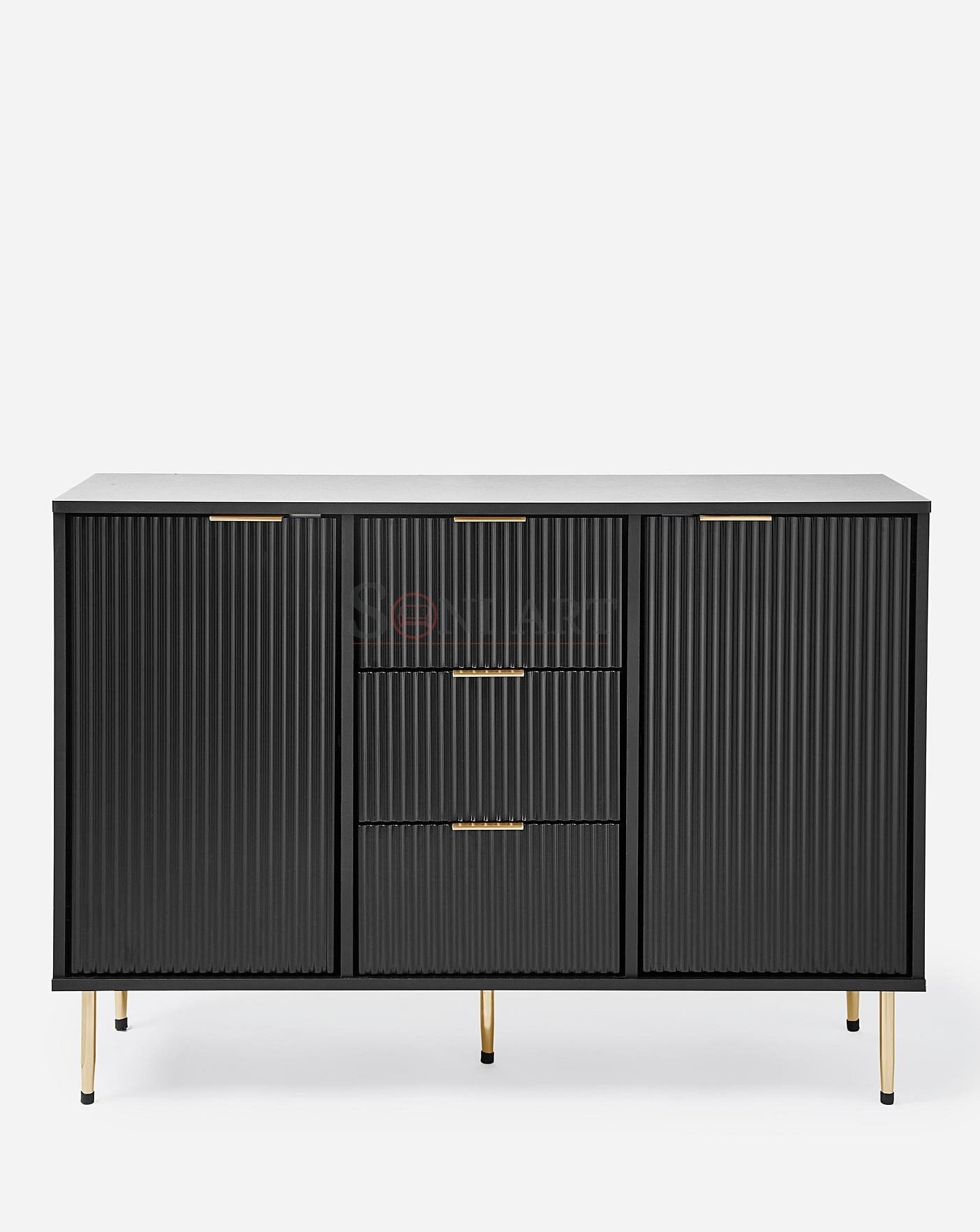 Add a touch of modern sophistication to your home with the Lunora Modern Black Ribbed Sideboard by Soni Art – a perfect blend of high-end design and everyday practicality. Crafted from premium solid wood, this statement piece features a striking ribbed front design, paired with sleek brass-finished legs and handles that instantly elevate the look of any space.