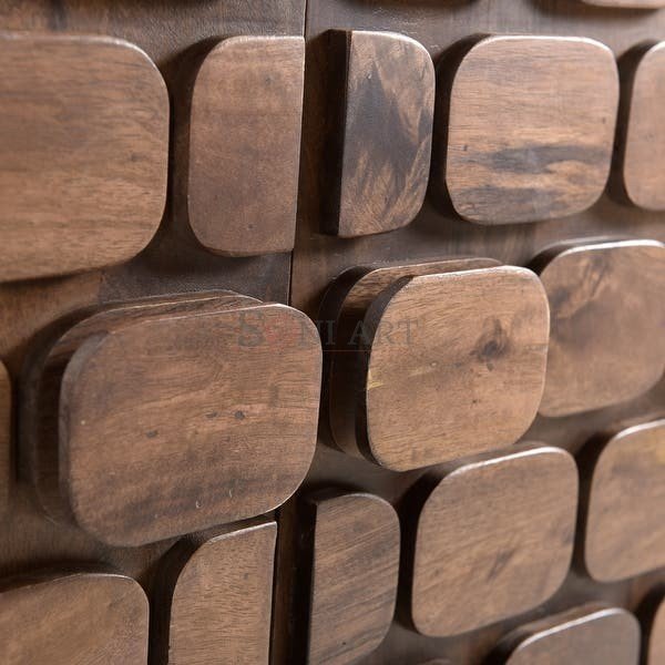 The Natora Wooden Sideboard features a rich walnut finish that beautifully highlights the natural grain of the mango wood, lending warmth and sophistication to any interior. The front showcases a carved pebble design on the three doors, adding an artistic texture that makes this sideboard stand out from ordinary storage furniture.