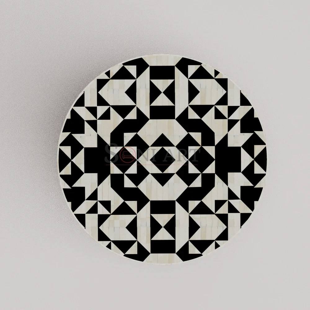 Elevate your living space with the striking elegance of the Noir Orb Round Bone Inlay Coffee Table, a perfect fusion of bold design and artisanal craftsmanship. Handcrafted by skilled artisans, this exquisite table features a captivating black and white geometric bone inlay pattern arranged in a symmetrical circular layout, creating a visually dynamic centerpiece that instantly draws attention. The intricate detailing reflects the richness of traditional inlay techniques while embracing a contemporary aesthetic.