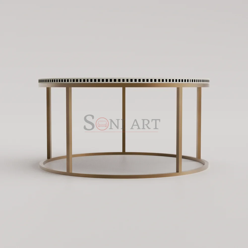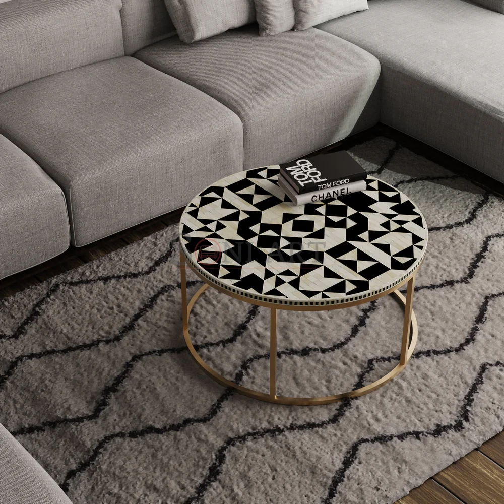 Noir Orb Round Bone Inlay Coffee Table in Black & White Geometric Design with Gold Base