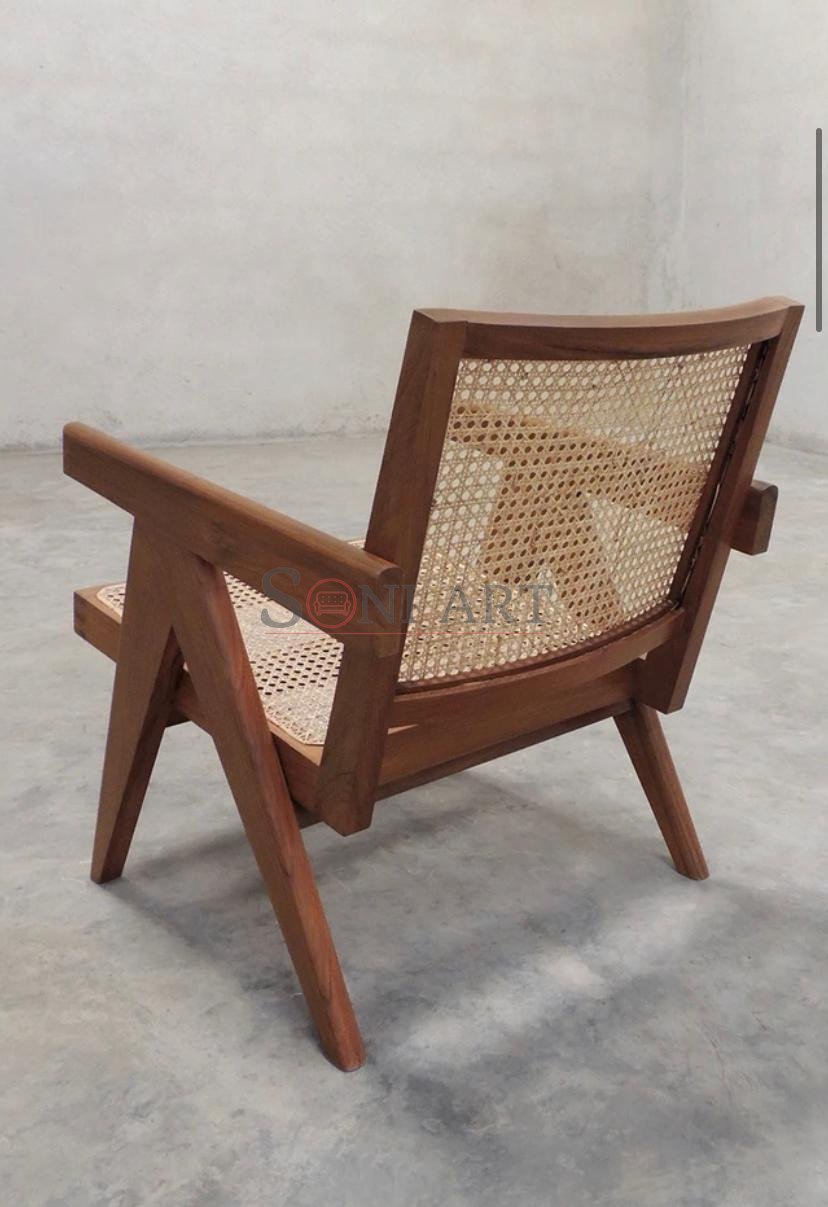 Constructed from sustainably sourced solid teak wood, the pierre jeanneret chandigarh chair showcases rich natural grain patterns and exceptional structural strength. Its signature angular frame, wide armrests, and gently reclined stance define the unmistakable Jeanneret aesthetic—bold yet understated, functional yet sculptural. The seat and backrest are finished with authentic hand-woven cane rattan, providing breathable comfort while adding warmth, texture, and vintage character to the design.
