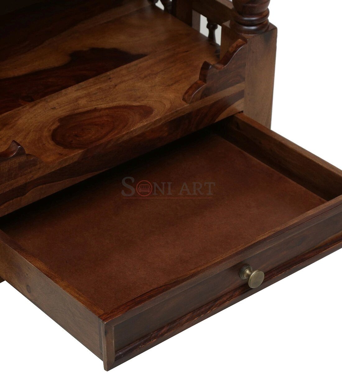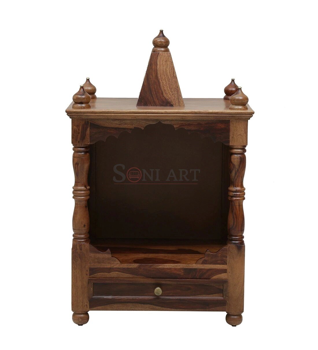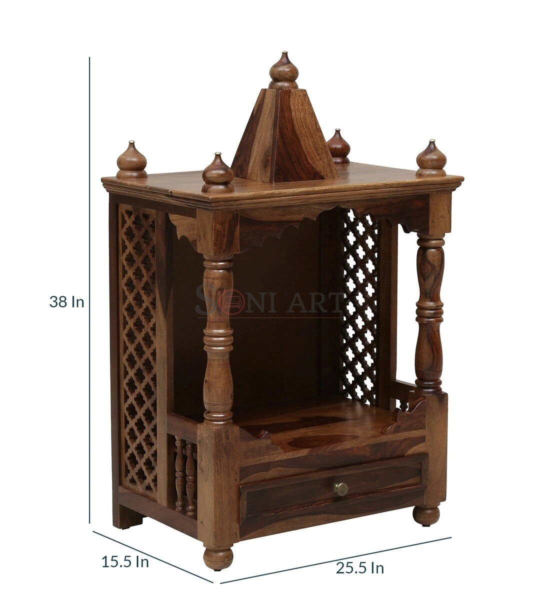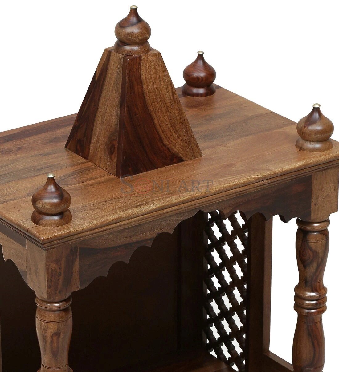 Bring divine elegance and timeless artistry into your home with the Pillar Carved Solid Sheesham Wood Home Temple Mandir. Expertly handcrafted from premium solid sheesham wood (Indian rosewood), this sacred piece embodies traditional Indian craftsmanship and enduring strength. The rich teak finish highlights the natural grains of the wood, lending warmth and serenity to your worship space.