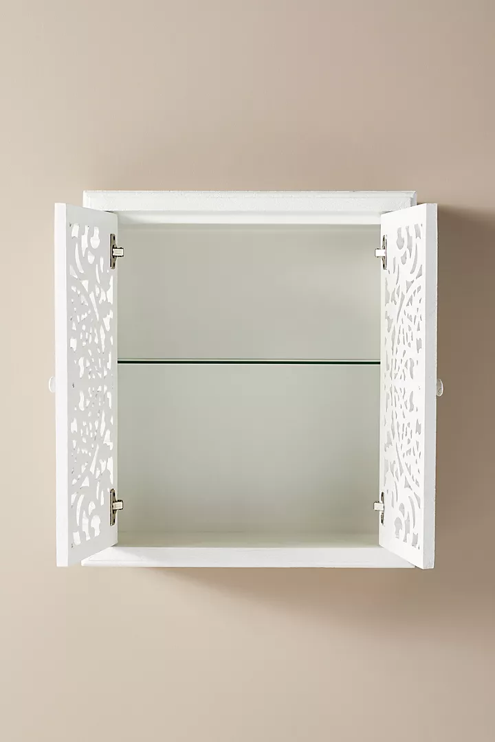 Designed to be both practical and decorative, the Roydon Carved Wall Mounted Cabinet offers ample storage with two internal shelves, perfect for organizing essentials in your bathroom, kitchen, living room, or bedroom. The carved wooden doors not only enhance its visual appeal but also allow subtle airflow, keeping stored items fresh and accessible.