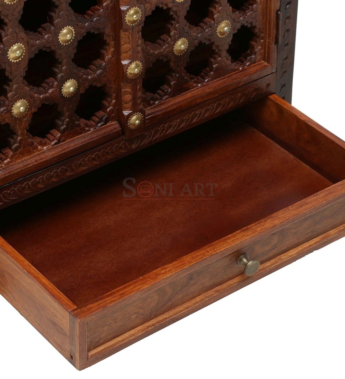 Designed with intricate hand-carved detailing on the doors, this mandir showcases the essence of traditional Indian design. The grand domed top enhances its temple-like appearance, symbolizing divine architecture and sacred beauty. The bottom drawer provides convenient storage for pooja essentials like diyas, incense sticks, cotton, and oils, ensuring everything stays organized and accessible for daily rituals.