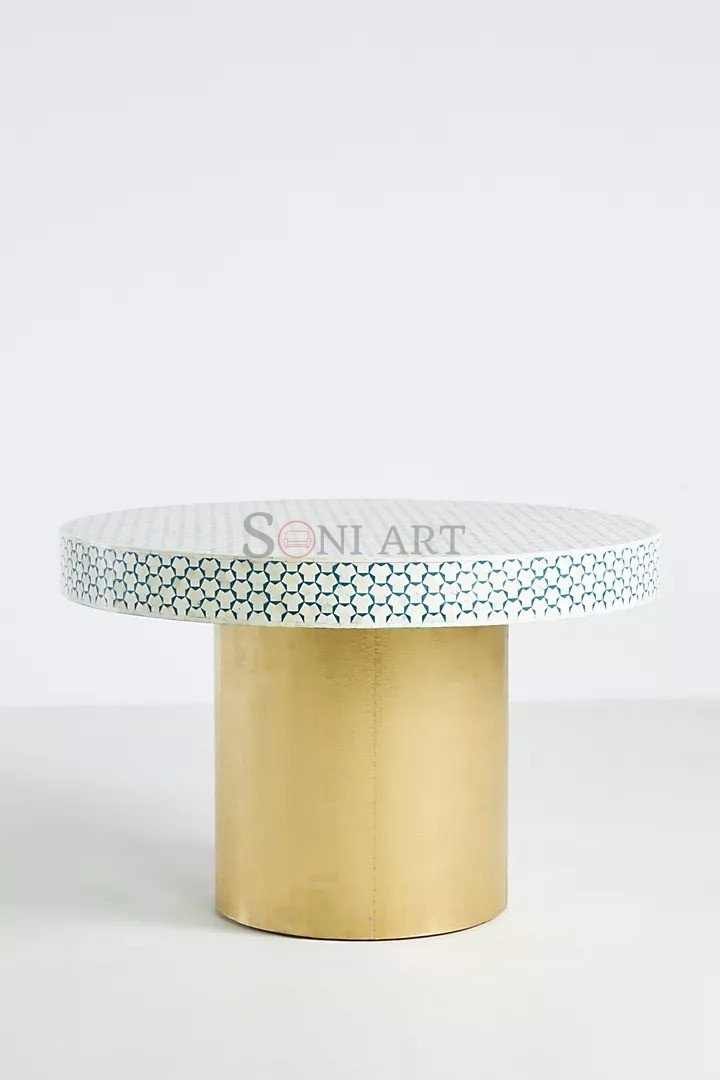 Triangu Bone Inlay Round Shape Dining Table Wooden Brass Base