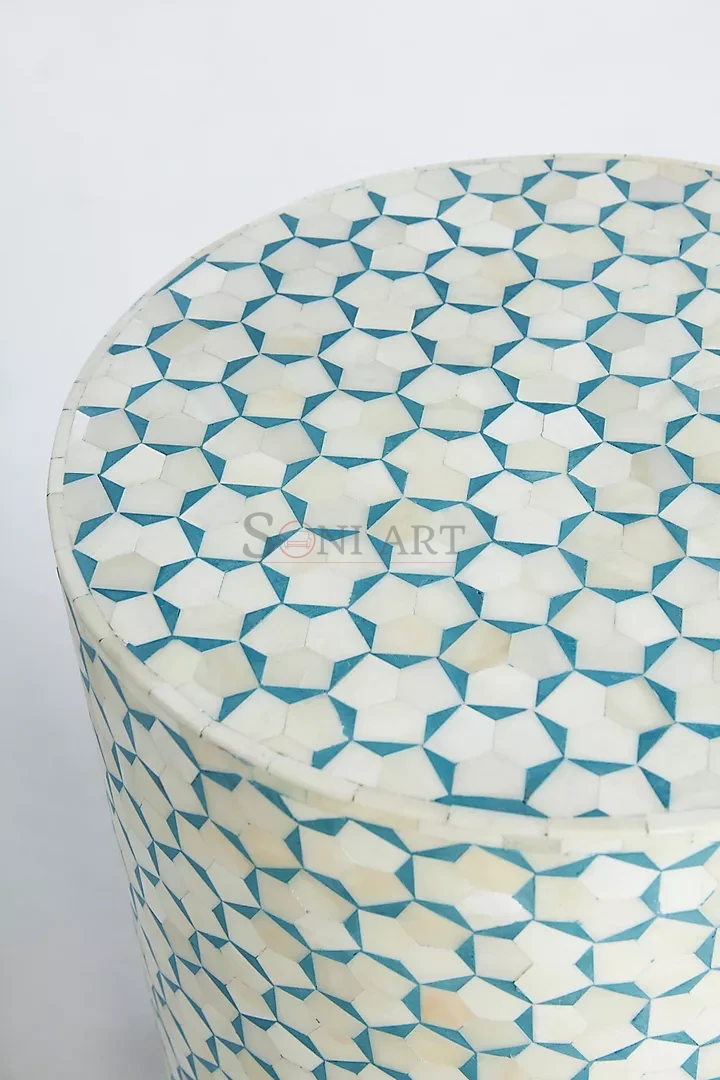 Designed in a smooth cylindrical round silhouette, the round side table offers a soft, sculptural presence that blends effortlessly into modern, luxury, bohemian, and boutique-style interiors. The intricate inlay work wraps seamlessly around the body, ensuring visual beauty from every angle.
