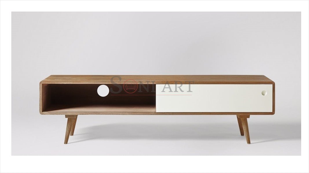With its clean lines, tapered legs, and minimalist form, this solid wood TV unit enhances your living space while offering practical storage. The open shelf provides easy access to media devices, while the closed drawer keeps your essentials neatly hidden. Designed for both function and style, this wooden TV unit with storage is a statement of simplicity and elegance.