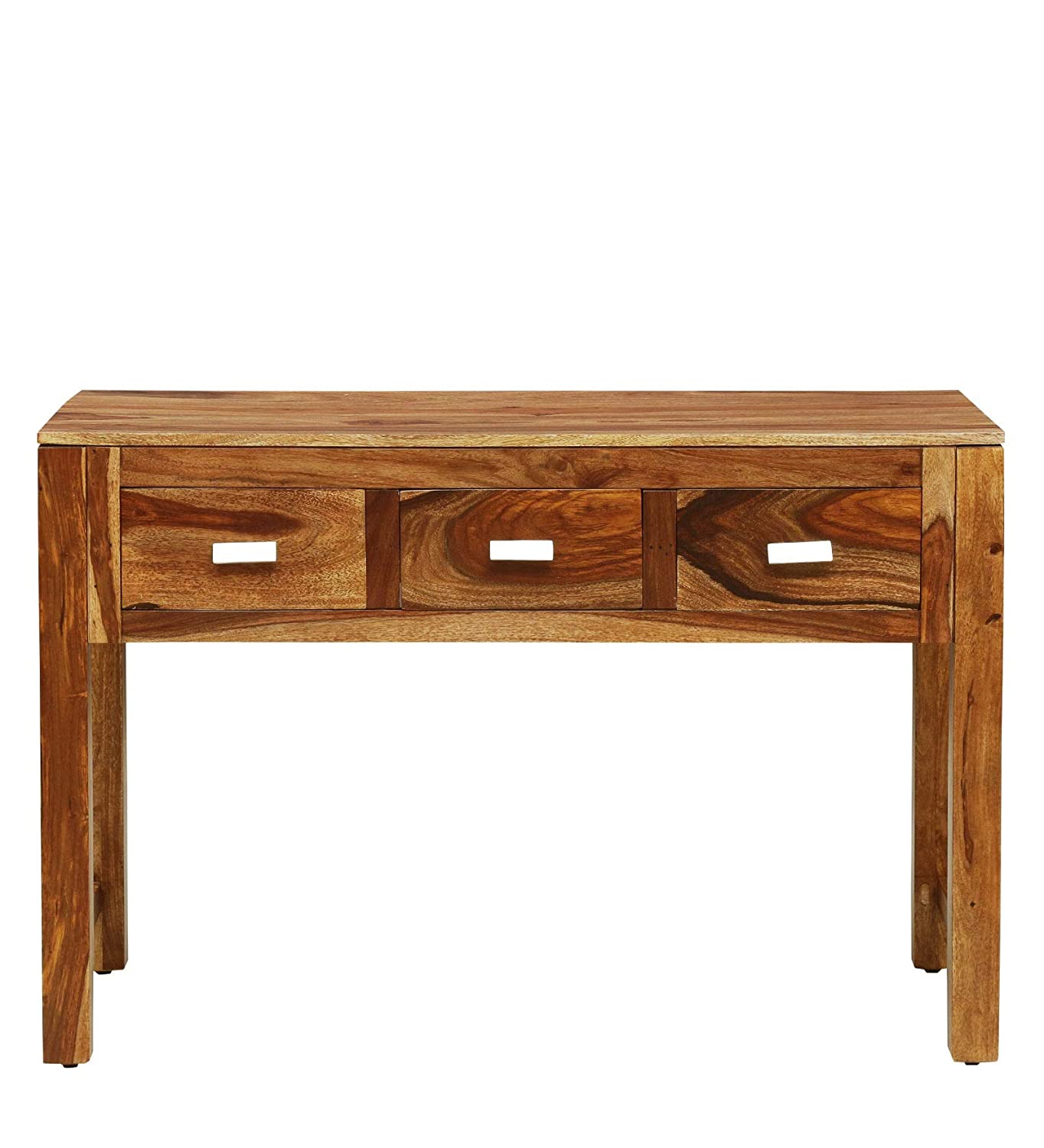 Upgrade your workspace with the timeless elegance of the Vera Indian Ethnic Writing Desk – a study desk with drawers, designed to blend classic craftsmanship with everyday functionality. Made from premium solid wood, this beautifully handcrafted wooden study desk showcases a rich natural wood grain finish that adds warmth and character to any interior setting. The subtle contrast of the weathered tabletop and sleek metal hardware creates a perfect balance between traditional charm and modern appeal.