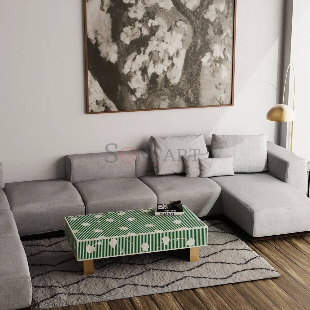Designed for homes that embrace individuality and refined aesthetics, this bone inlay coffee table combines traditional craftsmanship with a fresh, modern palette. The vibrant green tones introduce a lively yet sophisticated element, while the subtle floral detailing softens the geometric structure, creating a harmonious visual balance. Supported by a sturdy base with brass accents, it offers both durability and a touch of understated luxury.