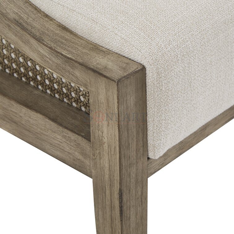 Soft beige upholstered seat and back cushions provide plush, everyday comfort, allowing you to sit back and relax for extended periods. The neutral color palette—combining warm wood tones, woven rattan, and light upholstery—ensures effortless integration into coastal, farmhouse, bohemian, or modern interiors.